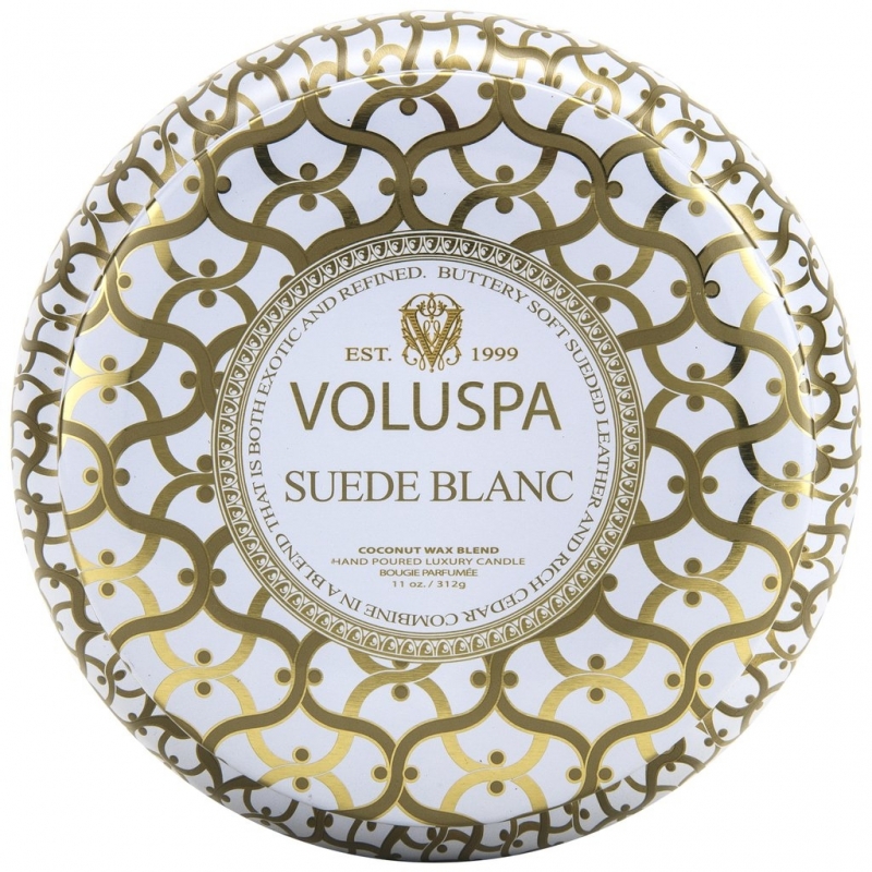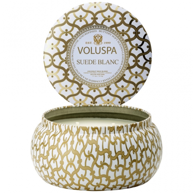 Notre bougie préférée... Élégante, présente et discrète... La bougie "Suede Blanc" Voluspa, aux notes de cuir suédé doux et de cèdre, présentée dans une boite en étain décorée.