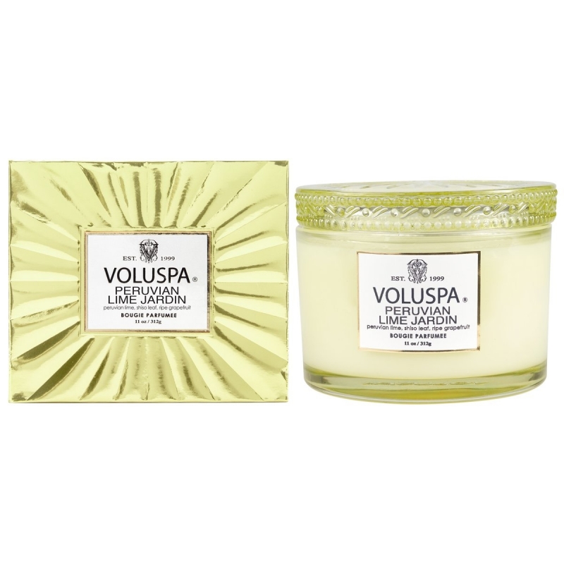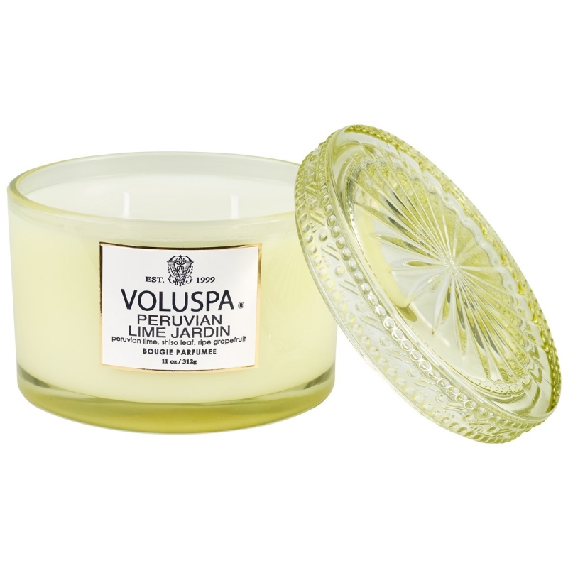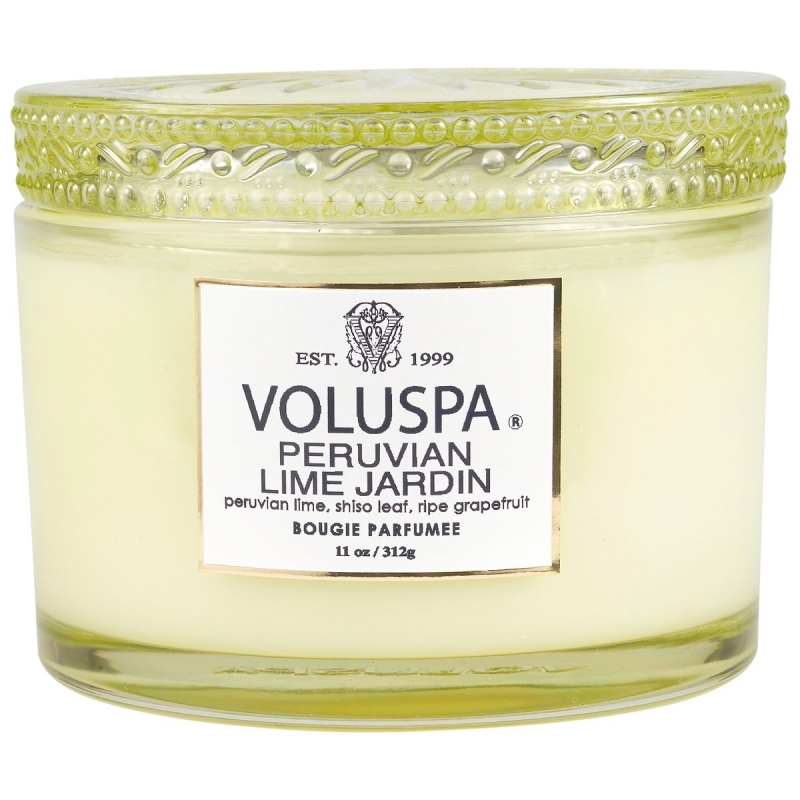 Code 3832 : cette superbe bougie Voluspa à deux mèches est dotée d'un couvercle en verre. La teinte limpide vert citron se marie parfaitement avec les notes parfumées de Peruvian Lime Jardin.
