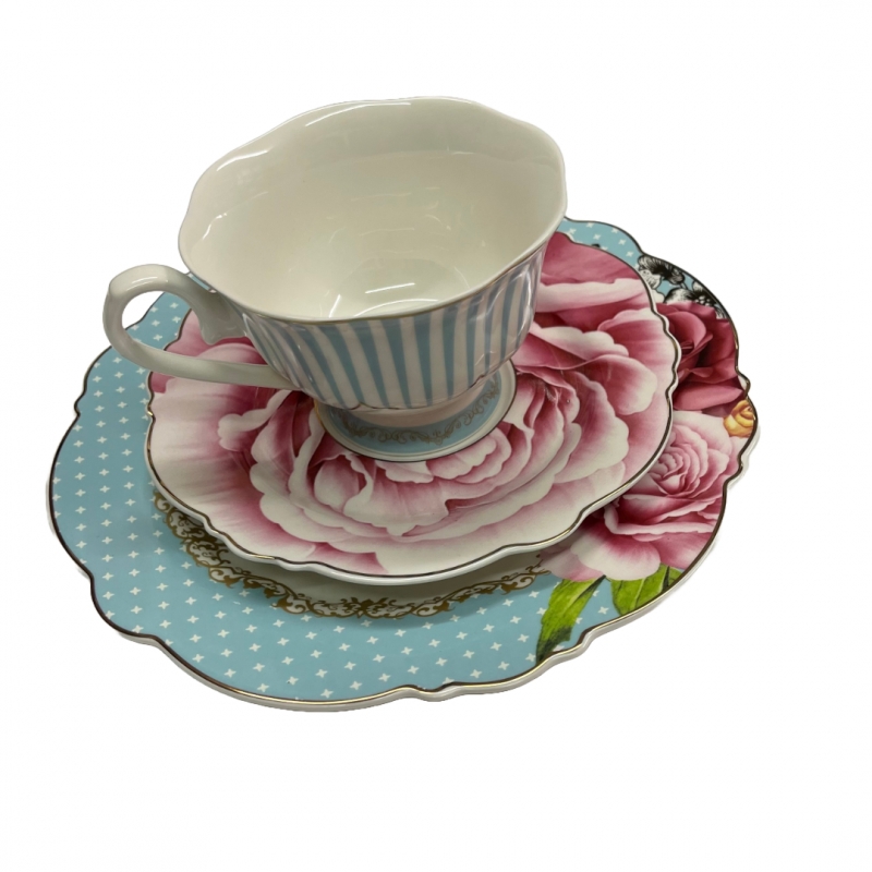 Se compose d'une assiette à dessert, d'une tasse à café et sa soucoupe.