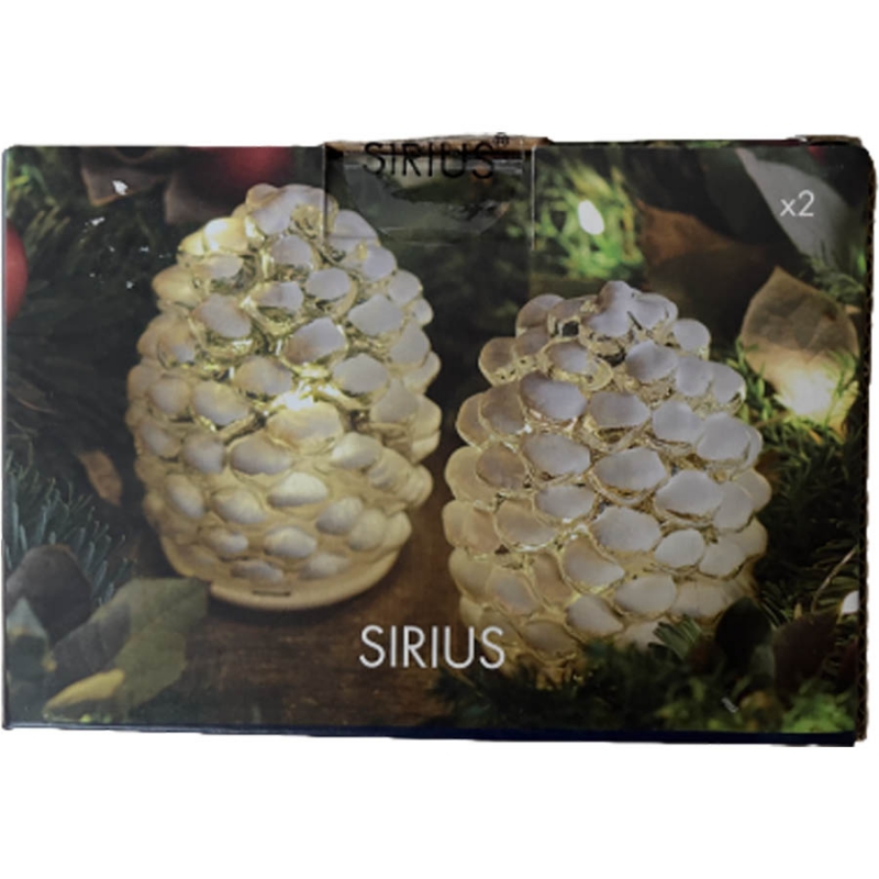 Boite de 2 pommes de pin enneigée avec led, de la marque Sirius.