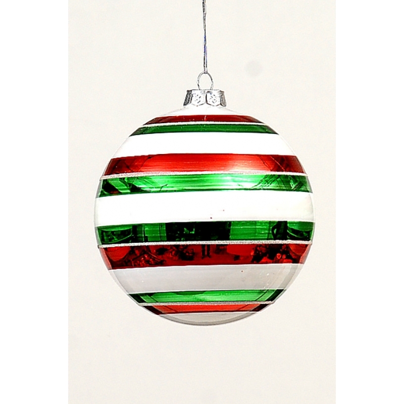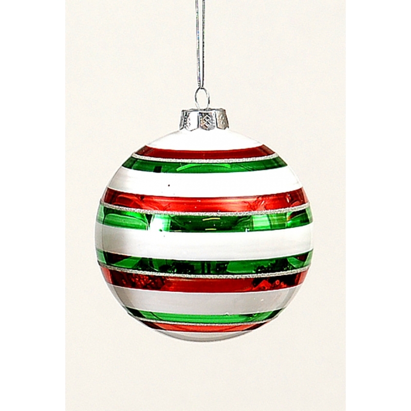 Boule de Noël - blanche avec rayures vertes et rouges 10 cm
